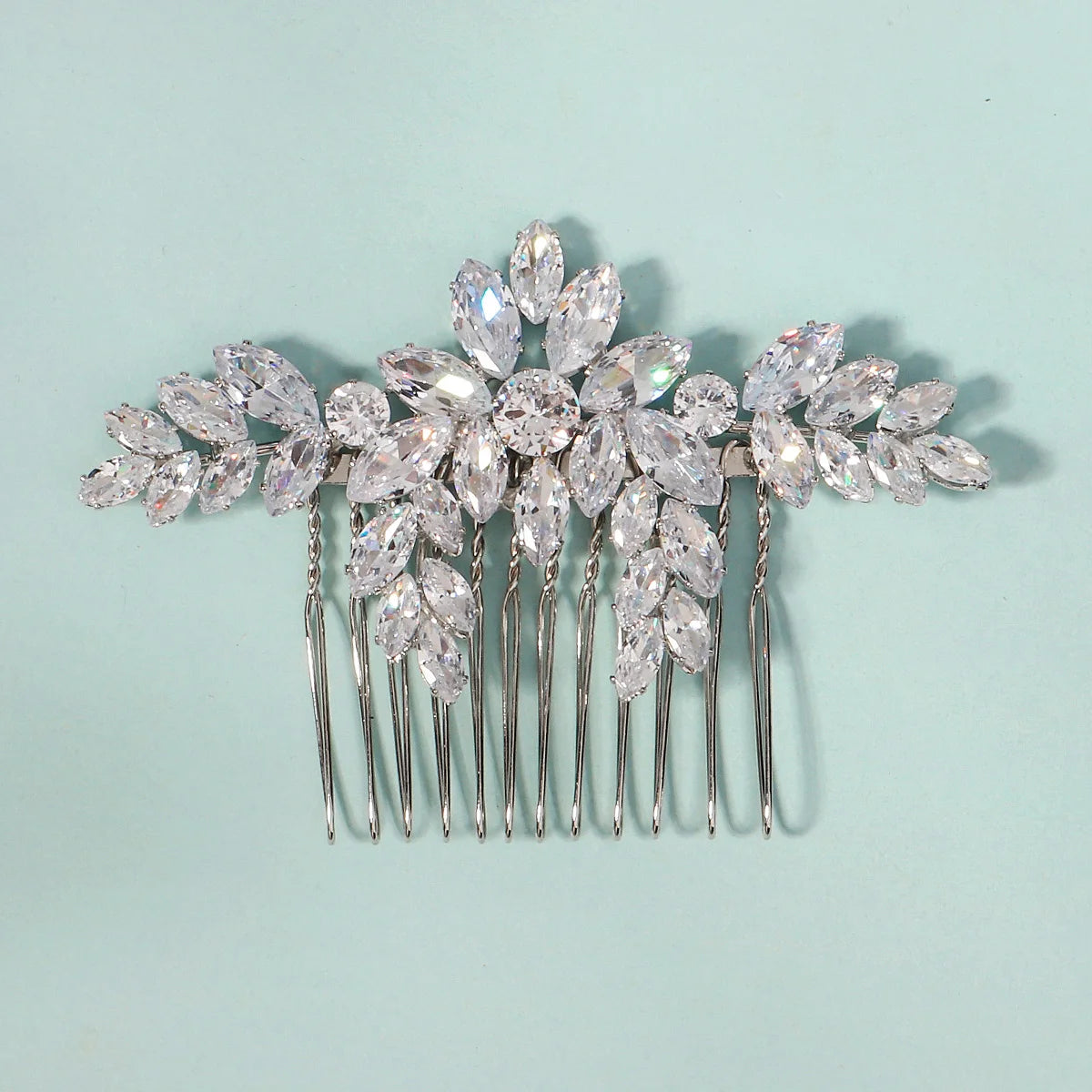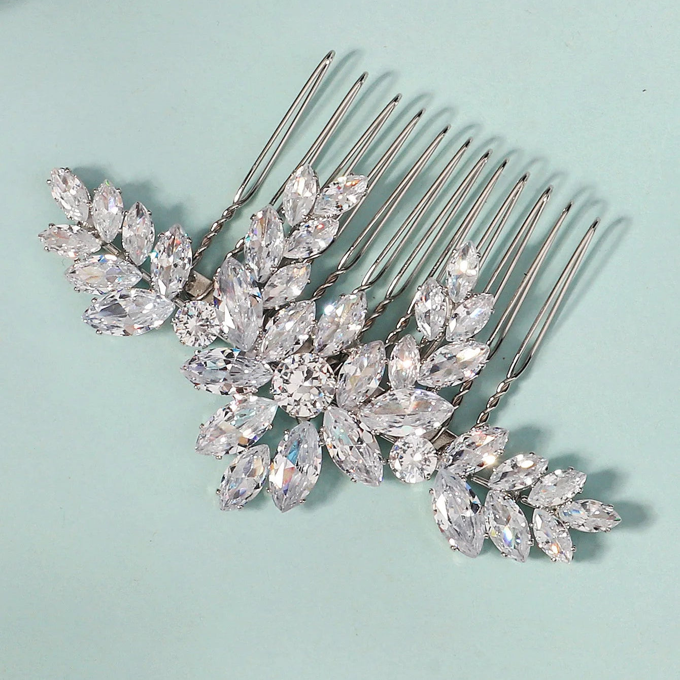 Ce peigne à cheveux cristal pour chignon de mariée se distingue par son design floral délicat composé de cristaux taille marquise et ronds finement sertis. Chaque élément est disposé avec harmonie pour créer un équilibre visuel élégant et structuré.