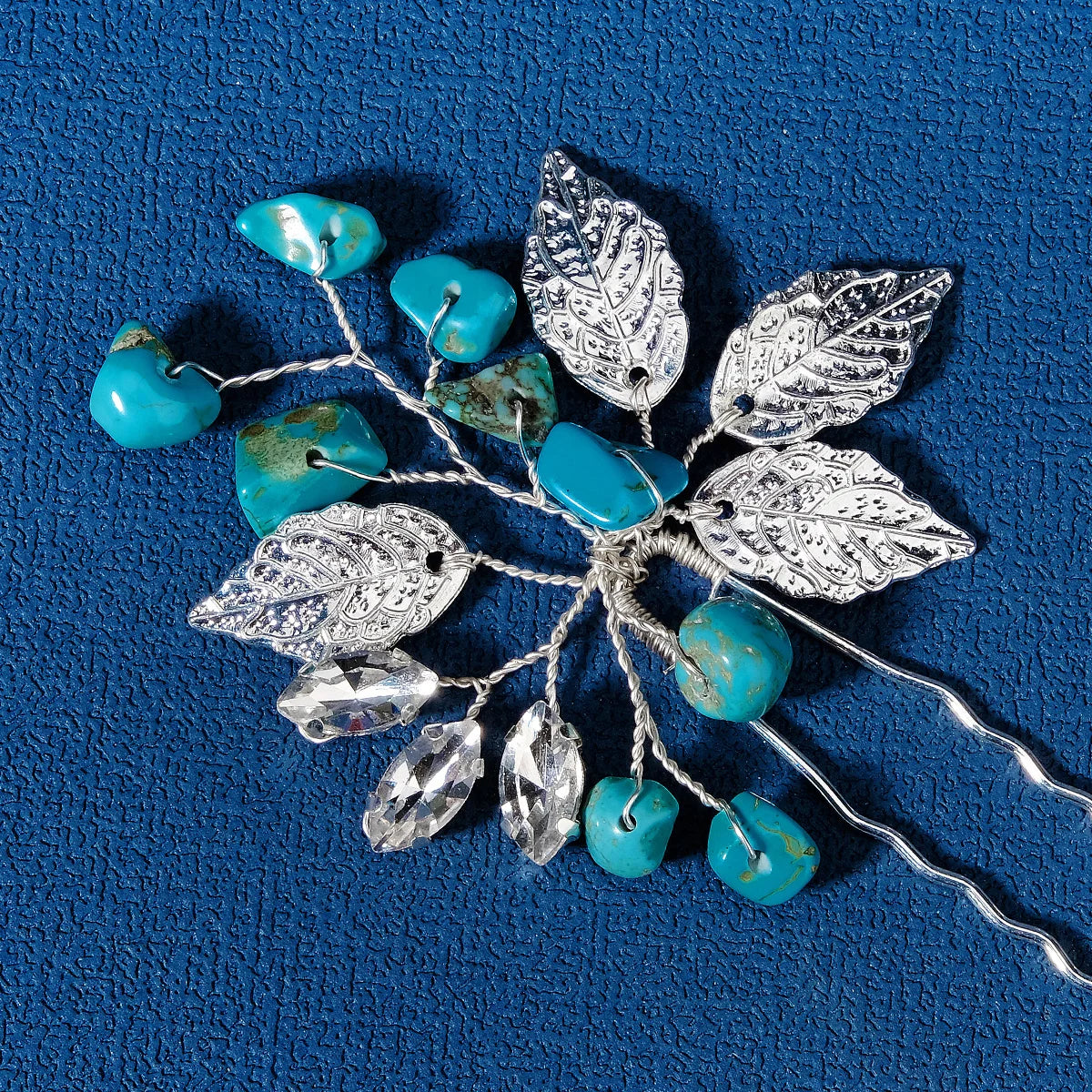 Les feuilles argentées évoquent l’esprit nature et artisanal, tandis que les pierres turquoise apportent éclat et profondeur. Ce bijou de cheveux bohème est parfait pour celles qui recherchent un accessoire à la fois original et intemporel.
